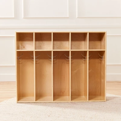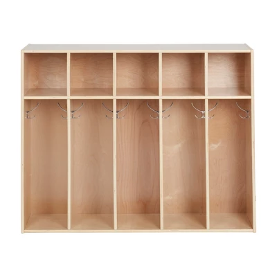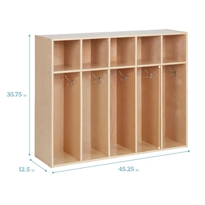Maximize space and keep your room organized and clutter-free with the ECR4Kids Streamline 5-Section Toddler Coat Locker. The wooden locker features five long compartments with ten double coat hangers for sweaters, toddler backpacks, and umbrellas. Give children their separate cubby storage to keep art projects, homework, and personal belongings organized. Pair with ECR4Kids Scoop Front Storage Bins to keep little things contained and off the floor; bins are sold separately. Use in a children’s bedroom to organize dress-up clothes, costumes, accessories, hats, gloves, and more. The low-profile open-face shelves encourage children to care for their belongings and clean up independently. The drop-and-go storage is constructed from sustainably harvested birch plywood with a tough UV lacquer that seals the wood surface and resists scratching. A UV inhibitor makes furniture resistant to ultraviolet light and yellowing. Natural birch plywood is extremely durable and will hold up to everyday use in daycare, and preschool, and is perfect for the home. Combine the Montessori storage with other ECR4Kids Birch Collection furniture pieces to complete the space. | Long Compartments measure 25.25″ H x 8.25″ W x 11.75″ D | Cubbies measure 8.5″ H x 8.25″ W x 11.75″ D