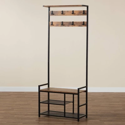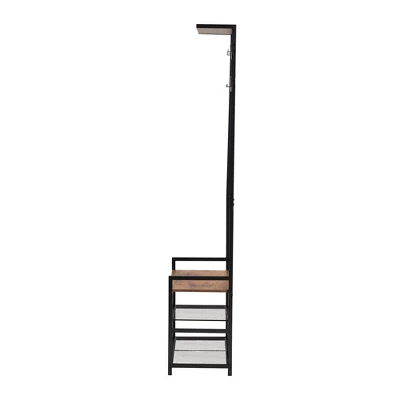 Uplift the potential of your entryway with the superb efficiency of the Edan coat hanger. Made in China, this remarkable piece is inspired by industrial design with an openwork metal frame fitted with wood. A total of eight hooks provide convenient space to organize coats while two open shelves at the base accommodate shoes and other outdoors essentials. The Edan requires assembly and features a smooth rectangular seat to assist in your daily routine. An additional open shelf at the top creates a wonderful display area, making the Edan coat hanger a fantastic anchor of any entryway. Overall Dimensions: 28.30″ W x 13.00″ D x 70.90″ H; Seating: 26.80″ W x 13.00″ D x 17.10″ H; Left Open Shelf Space (Each): 17.50″ W x 13.00″ D x 6.70″ H; Right Open Shelf Space: 8.70″ W x 13.00″ D x 14.10″ H; Distance between top of bench seat and Top hanger: 46.90″ H; Distance between top of bench seat and bottom hanger: 40.00″ H; Clearance: 1.70″ H;