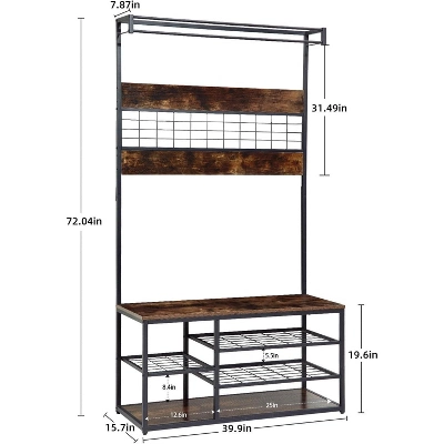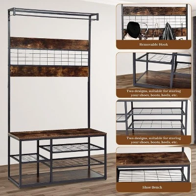Picture this: You walk through the door with armfuls of groceries, kicking off muddy shoes while trying to hang up your wet coat. With this industrial-chic hall tree, everything finally has its place. The five adjustable hooks pivot to hold bulky winter layers or delicate purses without crowding, while three spacious shelves swallow up to 18 pairs of shoes – with extra room for those knee-high boots you never know where to store.Built to handle real-life, the reinforced steel frame and scratch-resistant surfaces withstand daily abuse from kids, pets, and overflowing shopping bags. The smart design grows with your needs – use it as one complete unit in your entryway, or detach the shoe tower in seconds to create extra bedroom storage.Morning routines become smoother when you can actually find both shoes of a pair. Coming home feels more organized when coats don’t pile up on chairs. At 24″ deep, it tucks neatly against the wall but holds an impressive 220 pounds – sturdy enough to serve as seating when you need to tie your laces.This isn’t just furniture – it’s your personal organization assistant that makes everyday living just a little easier. The flexible system adapts as your storage needs change, proving good design should work for you, not the other way around.