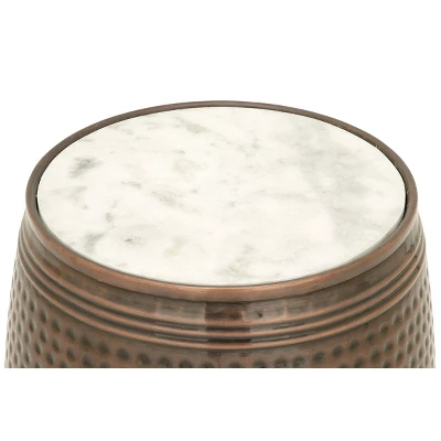 - •Hammered metal accent table sports a glossy dark copper finish with dark bronze undertone and white marble top