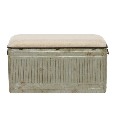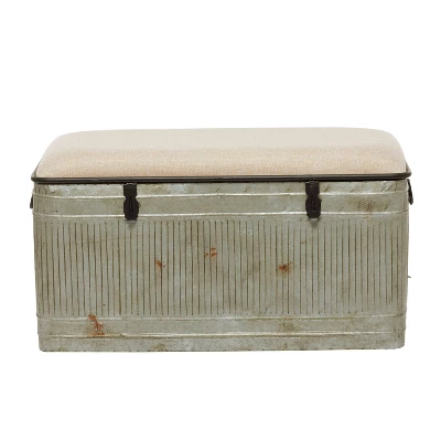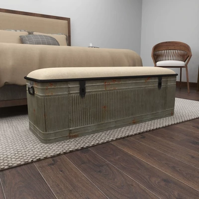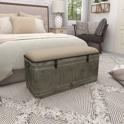 Get organizing with this pragmatic storage trunk bench and add a charming and highly pragmatic piece to your hallway, entryway, or living room spaces. This item ships in 1 carton. Suitable for indoor use only. This item ships fully assembled in one piece. Maximum weight limit is 250 lbs. Can accommodate 2 people. This is a single gray colored entryway bench. Farmhouse style.