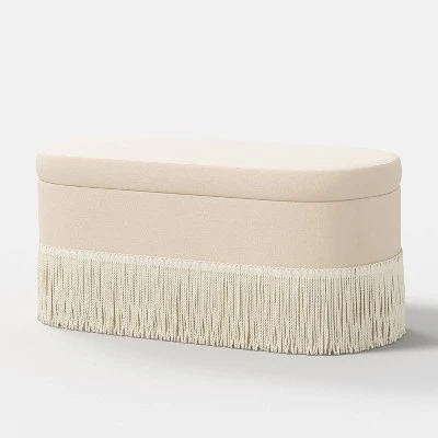 Bring extra seating with a dash of style to your indoor space with this Fringe Bench from Threshold™. This upholstered bench boasts a bohemian look with fringe detailing supported by a wooden frame for a luxe feel that blends effortlessly with any decor style. Solid fabric upholstery blends easily with your existing decor, while the generously padded seat offers a comfy sitting experience whether you’re sliding on your shoes, settling down with a book or just enjoying an evening chat together.