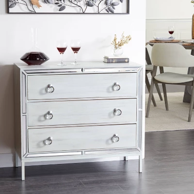 Beautifully crafted with durable structure and design for a long lasting enjoyment to keep your space free of clutter. A spacious piece of furniture that can instantly transform the look of any room in your home. Add this white storage chest to a corner of your glam-style home office or living room. This item ships in 1 carton. Built with 3 pull out drawers that measures 32″L x 15″W x 7″H with 30 lbs weight capacity. This is a three-drawer chest. Suitable for indoor use only. Maximum weight limit is 100 lbs.; each drawer can hold up to 30 lbs. Glam style.