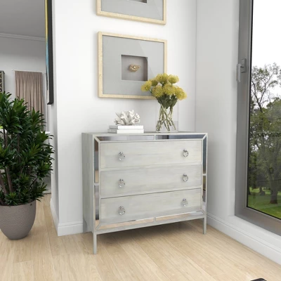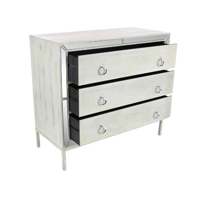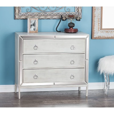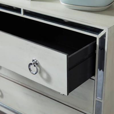 - Bone white frame with reflective and silver accent finish highlights this glam chest drawer