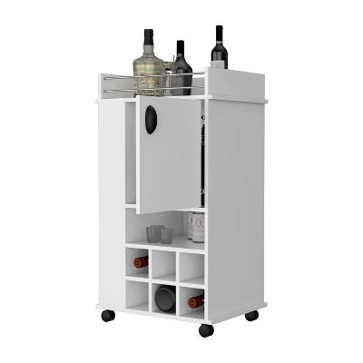 Elevate your entertaining experience with the Gulches 1-Door Bar Cart, designed for both style and functionality. This elegant white cart features smooth-rolling casters for effortless mobility, allowing you to position it wherever you need. With six built-in wine racks, it beautifully displays your finest wines, while two spacious side shelves provide ample space for glassware and decor. The single-door cabinet offers additional storage for bar essentials, keeping everything organized and within reach. Perfect for gatherings or everyday use, this versatile bar cart enhances any space.