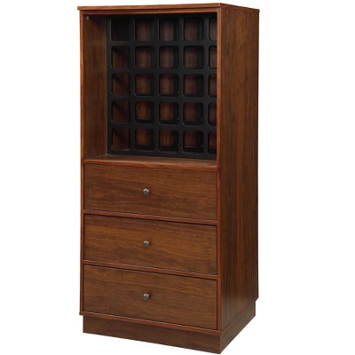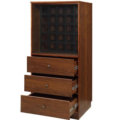 This free-standing wine cabinet offers ample storage for wine enthusiasts, with space for up to 25 bottles in 4″x4″ compartments and 3 large drawers (21″x13″x5″H) for accessories. Built with a durable wood case-frame, laminate veneer, and MDF, it features side metal glides for smooth drawer operation and a fully finished interior for a refined look. Perfect for home bars or dining areas, its rectangular design and single pull-knobs blend functionality with practical style, making it a reliable storage solution for your wine collection.