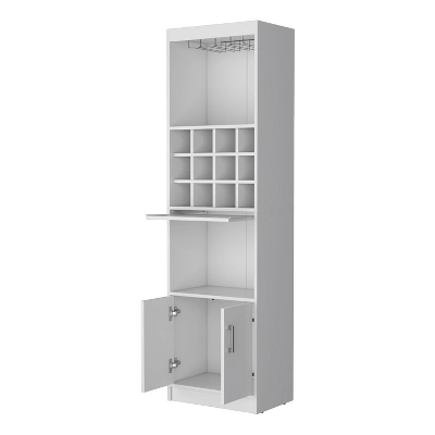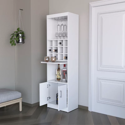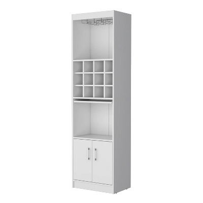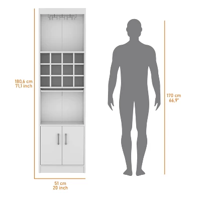 This compact bar cabinet is designed to maximize functionality in tight spaces, featuring integrated wine storage for easy access to your collection. With multiple shelves and two doors that open to reveal extra storage, it effortlessly organizes bar essentials, glassware, and accessories.Measuring 71.1” (H) x 20” (W) x 13.3” (D), it fits perfectly in small home bars, dining corners, or even bathrooms, making it a versatile addition to any room. Built with high-quality materials, it¡¯s durable enough for daily use while maintaining a sleek, functional design.Note that decor and setting objects are not included, but this multifunctional cabinet ensures your bar essentials stay tidy and accessible, combining practicality with space-saving efficiency.