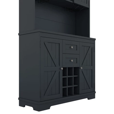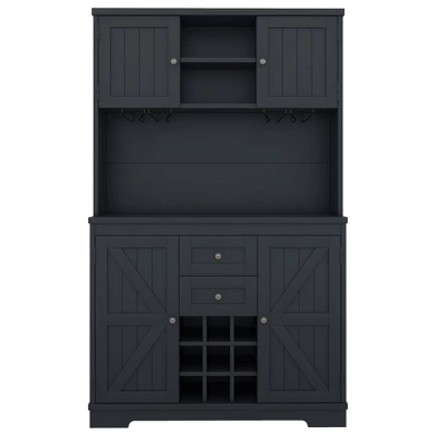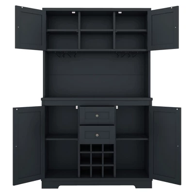 This bar cabinet marries timeless style with practicality, making it a versatile addition to any home. Its classic design, featuring open shelves and cabinets in elegant colors, enhances dining rooms or kitchens, providing the perfect spot to showcase dinnerware, barware, or decorative items.Beyond aesthetics, it maximizes storage: a top shelf offers display space, while 6 hooks on an iron tube let you hang cups or small essentials, expanding functionality beyond traditional cabinets. The 9-grid bottle holders neatly organize wine bottles or coffee cups, and a large center open shelf accommodates storage boxes or daily items¡ªallowing it to double as a coffee bar, wine bar, or kitchen buffet.Crafted from durable MDF and particle board, it¡¯s built to last: high-quality hardware ensures cabinet doors open and close smoothly, and the sturdy tabletop safely supports heavy appliances like coffee makers or microwaves. Cleaning is effortless, ensuring long-term usability.