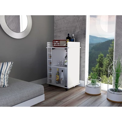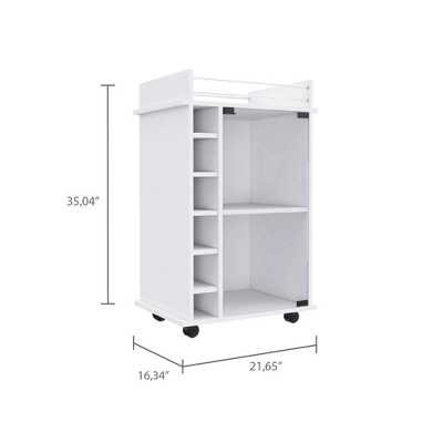 Enhance your entertaining space with the Gulches White Bar Cart, featuring a stunning glass door cabinet and two interior shelves. This stylish cart includes six built-in wine cubbies and a spacious top surface with a metal rail for added safety. Standing at 35 inches tall, it¡¯s the perfect height for serving guests. With four locking casters for easy mobility and clear assembly instructions, this bar cart combines elegance and functionality seamlessly.