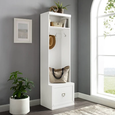 Embrace the beauty of an organized entryway with the Harper Hall Tree. Slimmer than a traditional hall tree, this tower has four large hooks for hanging coats, hats, and scarves. An open storage shelf on top and a full-extension drawer in the base, make this tower more than a traditional coat rack. The label holder hardware on the storage drawer is customizable allowing for more personalized organization. Modular in design, the Harper Hall Tree can be paired with a variety of items within the collection.