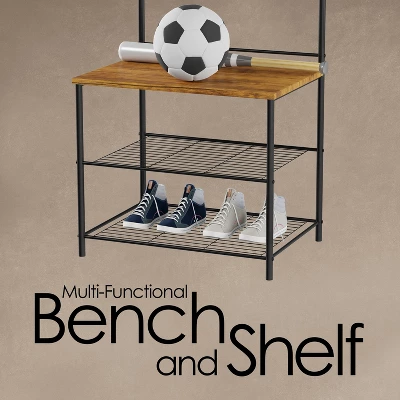 - 4-IN-1 ENTRYWAY ORGANIZER – This multi-functional hall tree features a bench with storage for shoes or handbags, 9 hooks to hang items, and an upper rod for items on hangers. The easy-to-assemble coat stand is ideal for a mudroom, hall, or bedroom.