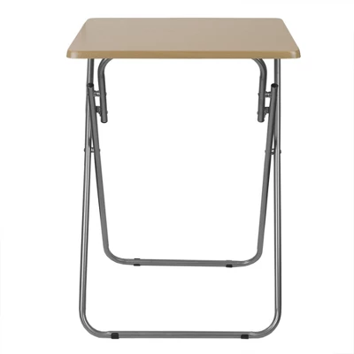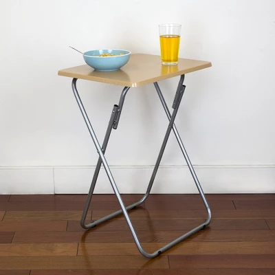 A portable table whenever and wherever you need it. Looking to change it up and enjoy your meal Prop it in front of the television, so you’ll never miss a minute of your favorite show or movie. The top features a wide surface area to easily accommodate a full-size plate, utensils, a glass of your favorite beverage, with room to spare to keep your remote close at hand and your phone within your grasp. Or use it for extra serving space to display a colorful array of hors d’oeuvres outdoors. The table conveniently works as a No wobbling whatsoever with this high-end table! It’s crafted of solid wood and rests on sleek, but sturdy stainless steel legs that enable it to be used on a variety of floor surfaces. In addition to its durable construction, it features a richly grained designed surface top with a simple silhouette that will enhance any décor. The table folds flat in a sleek footprint to conserve precious storage space.