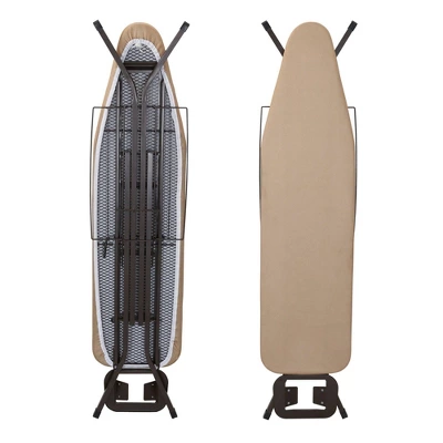 With stunningly chic style and a smart design, this deluxe ironing board stands out from the crowd. Using this ironing board promises crisp results on button-ups, slacks, bedsheets, tablecloths, curtains and more. Unlike SOME other ironing boards, this boasts a durable mesh steel top. This durable mesh offers more stability and allows steam and heat to circulate through fabric for better, faster and more even results than you’d get with other steel-top boards. This steel mesh top is a must-have feature for anyone who irons frequently, especially with steam or higher temperatures. This ironing board utilizes additional improved features, including durable hex legs with skid-resistant caps and a sleek, elegant bronze finish. The 4 hex legs cover a greater surface area to provide the best form of stability. The gray FiberTech cover attaches to the ironing board with a simple drawstring cord. Underneath the cover is a durable, 6mm-thick fiber pad. This thick layer prevents imprints from the steel ironing surface transferring onto your garments and creates a smoother finish. The cover and pad has been stress tested to ensure durability and resistance to high temperatures. This ironing board creates enviable results and is highly convenient. Attached to the end of the board is an iron rest outfitted with heat-resistant silicone pads. This serves as a safe and reliable spot to rest your iron as it warms up and cools down. This iron rest has multiple slots to hang articles of clothing within reach. The board has 4 height settings that can be adjusted with a quick push of a lever. This deluxe ironing board can be folded down for compact storage. It can easily hang behind a door, on the wall or inside a closet. The modern matte finish and functionality of this ironing board make it the prime choice for anyone looking to complete their daily ironing in style.