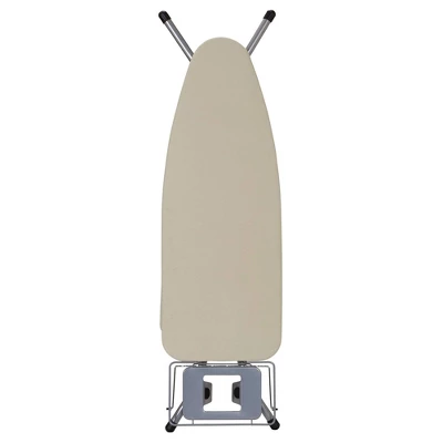 A prime choice for the individual looking to invest in their laundry care, this mega ironing board provides a wide workspace and various characteristics to make ironing a more enjoyable part of your daily or weekly chores. One of the defining features of this ironing board is the 4-leg support system. With its superior 4-leg design and black leg caps for traction, this ironing board offers the greatest stability as compared to other styles. The metal frame is also thicker than cheaper alternatives. Use the leg lock to achieve a comfortable height with a variety of different height options. Instead of plastic or thin and pliable metal, this ironing board has a strong steel mesh top. This top is not only less likely to warp or crack, but also allows heat and steam to distribute evenly. The 100% cotton cover and 6mm fiber padding are heat-resistant. The thick, dense fiber padding also adds a nice cushion to help your iron glide across with little worry of wrinkles and imprints. This ironing board would be an especially useful household essential for anyone who habitually irons for everyday outfits, work clothes or even crafts. The retractable sleeve board adds to this item’s luxury to make perfectly crisp sleeves a reality. The iron rest and hanger bar add an element of speed and convenience. To store, use the leg lock to fold the ironing board flat with a reassuring click.