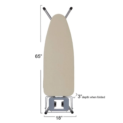 - Ironing board measures 59 inches L x 18.75 inches W x 31-38 inches H when in use; 65 inches H x 3 inches D when folded