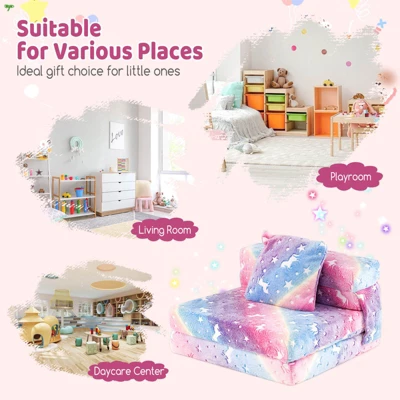 - NIGHTLIGHT FUNCTION: The cute pattern on the folding sofa bed will glow in the dark under sunlight or bright indoor light. This amazing feature will capture your child’s attention and fill their playtime with endless imagination.