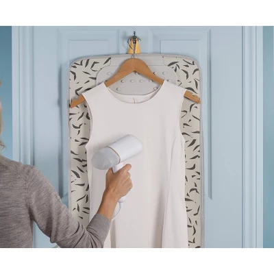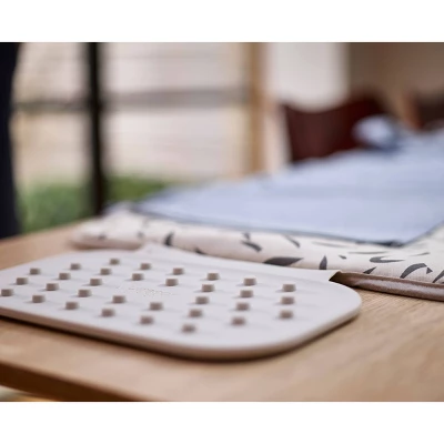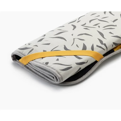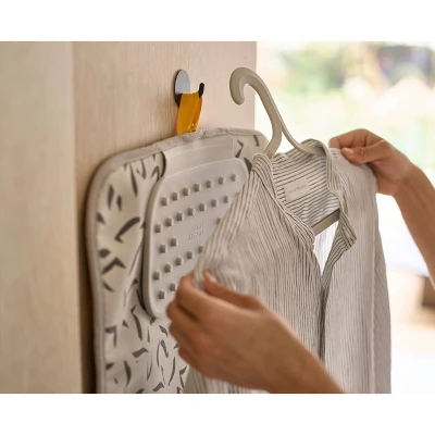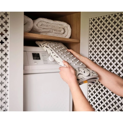 Struggling for ironing space? This handy ironing mat allows you to quickly set up to iron on any flat surface, such as a table or worktop. The mat is heat and steam-resistant using multi-layer DripLock™ Technology. This features a high-quality cotton top layer with an extra thick padded underlay, a waterproof layer and finally a trusty non-slip layer. When you need to place down your iron, there’s a fold-out silicone iron rest providing a safe place for it to stand. It also has a hanging loop for when steaming garments against a door or wall – you can also store it this way, or just fold it up and secure it with the elastic straps for compact storage.
