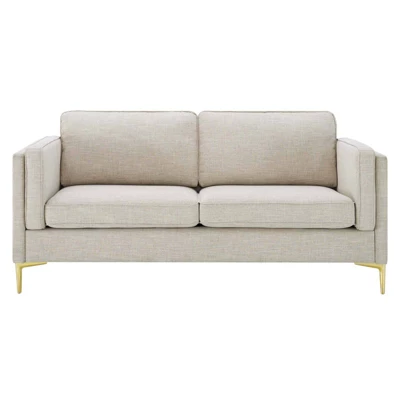 Invigorate your living space with rich tactiles and retro modern charm with the Kaiya Fabric Sofa. Putting a contemporary twist on a classic mid-century modern design, this living room sofa features subtle French piping detail, a tailored profile, and gold metal accents. Covered in soft polyester fabric, this upholstered sofa is padded with dense foam and complete with a sinuous spring support system to offer a premium seating experience. Resting on gold metal legs with non-marking foot pins, this fabric sofa features a solid wood construction for lasting durability. Assembly required. Sofa Weight Capacity: 900 lbs.