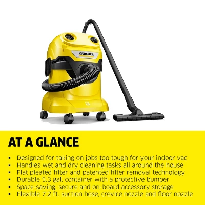 Tackle the toughest cleaning jobs with the Kärcher WD 4 Wet and Dry Vacuum Cleaner. Designed to handle car, garage, and yard tasks that your standard vacuum can’t handle, this powerful machine is equipped with an 1100w motor and a robust 5.3 gallon (20l) container. From light dust to heavy rubble and liquid, it effortlessly picks up any debris. Switch seamlessly between wet and dry cleaning thanks to the clever flat pleated filter system. No need to remove the filter, making it convenient and easy to switch between different cleaning tasks without coming into contact with the dirt. The Kärcher WD 4 also features special floor nozzles that make vacuuming effortless, ensuring optimal cleaning performance for any job.With its compact size, the WD 4 is easy to transport and store. All accessories are safely stowed on board, ensuring they’re always close at hand when you need them. The extra-long 7.5 ft. (2.2m) suction hose and cord provide a longer total reach, allowing you to clean those hard-to-reach areas with ease. Built with robust construction and made in Europe, the Kärcher WD 4 is designed to withstand heavy-duty use. Its small footprint makes it ideal for storage in any space, whether it’s in your garage, workshop, or utility room.The Kärcher WD 4 comes with a range of accessories, including (2x) 1.8 ft. (0.5m) suction tubes, a hand nozzle, a crevice nozzle, a wet/dry floor nozzle, an automotive-style pleated filter, and a fleece filter bag. It’s a complete package that caters to all your cleaning needs. Whether you need a shop vac, heavy-duty vacuum cleaner, or an outdoor vacuum for your patio, this reliable machine is up to the task. Perfect for industrial use, garage cleaning, and various cleaning jobs, the Kärcher WD 4 is your go-to solution.