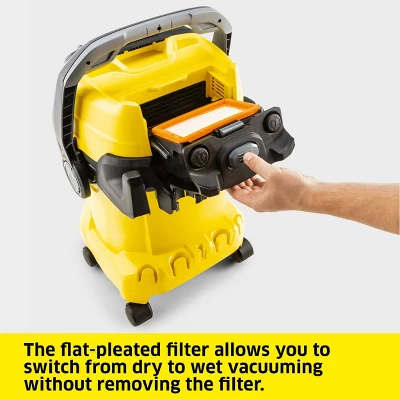 - Semi-Automatic Filter Cleaning: Features a patented, top-mounted filter removal technology for easy access and a semi-automatic filter cleaning technology for extra comfort while using. Thanks to the flat pleated filter, the filter doesn’t need to be removed while switching between wet and dry vacuuming