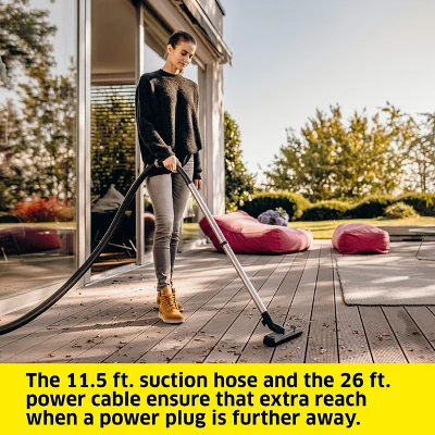 Tackle any cleaning task with the Kärcher WD 6 P S Wet/Dry shop vac whether you clean your home, garage, or outdoor spaces. With its patented filter removal system and sturdy construction, this vacuum offers unparalleled power and efficiency. Made in Europe, it ensures top-notch quality and reliability. Featuring an extra long 11.5 ft. suction hose and a 26.3 ft. power cord, the Kärcher WD 6 P S provides an extended reach for those hard-to-access areas. No more limitations while cleaning! Its compact design allows for easy storage, making it the perfect choice for any space. Switching between wet and dry vacuuming has never been easier. With the Kärcher WD 6 P S, there’s no need to remove the filter. Effortlessly tackle any mess, whether it’s liquid spills or dry debris. The drainage screw conveniently empties fluids that have been vacuumed up, ensuring a hassle-free cleaning experience. Equipped with a blower function, this vacuum is ideal for cleaning areas that are difficult to reach with a regular vacuum. Say goodbye to dirt and dust in every nook and cranny. Additionally, the semi-automatic filter cleaning feature allows for efficient maintenance by simply pressing the filter cleaning button, ensuring consistent suction power.The Kärcher WD 6 P S comes complete with a wide range of accessories, including an 11.5 ft. suction hose, (2x) 1.8 ft. stainless steel suction tubes, a hand nozzle, a crevice nozzle, a switchable wet/dry floor nozzle, a flexible hose for connecting power tools, an automotive style pleated filter, a power tool adapter, and a fleece filter bag. It’s a true all-in-one solution for all your cleaning needs. Experience the power and versatility of the Kärcher WD 6 P S Heavy Duty Vacuum Cleaner. Whether you need to clean your garage, patio, or tackle heavy-duty messes, this shop vac is your go-to. Perfect for industrial use, it’s designed to handle even the toughest cleaning tasks. Say goodbye to water damage with its water vacuuming capabilities, making it ideal for dealing with flooding. With its robust construction and reliable performance, the Kärcher WD 6 P S is the ultimate choice for a heavy-duty vacuum cleaner.