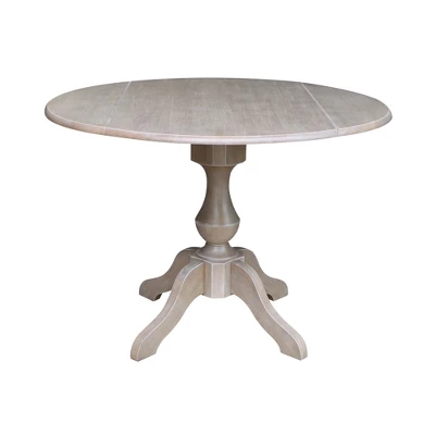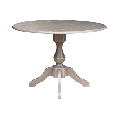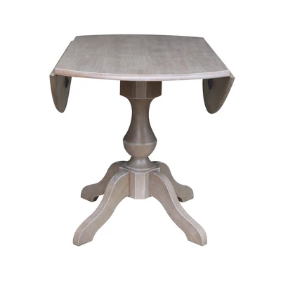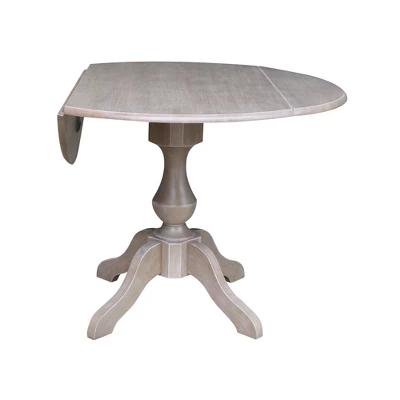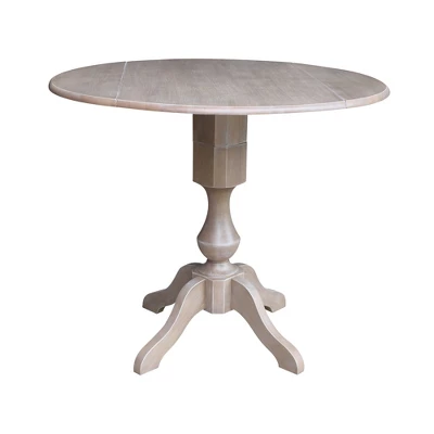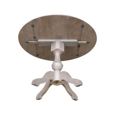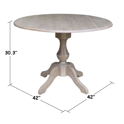 International Concepts home furniture is for those who appreciate high quality, wood furniture with a traditional and elegant look. This piece will beautifully complement your kitchen or dining room. This dual dropleaf dining table is made of solid wood. It measures 42″W x 42″D, with 9″ drop leafs on each side. The pedestal base has four feet for maximum support. It is available in dining height, counter height or bar height. It has a washed gray taupe finish, and comes ready to assemble.