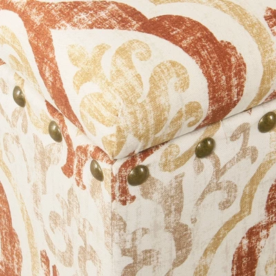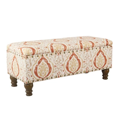 Add style and storage to any room in your home with our classic long storage bench. Featuring timeless nailhead trim and dark walnut wood legs, our multifunctional orange and cream medallion print storage bench can provide seating and double as a coffee table, serve as a bedroom bench or as an entryway bench with storage. The print easily blends with many different styles and colors. If you’re looking for a premium addition to your home at a reasonable price, make this your next accent furniture investment. Easy to assemble and maintain. Please note that fabric and wood colors may appear slightly different due to variations in lighting or screen settings.