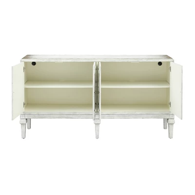 The rubbed through effect of the Stanford White finish on the plank top and the raised dimensional design on the four door fronts add subtle yet distinctive touches to this outstanding Credenza. Spacious, with adjustable interior shelving and a built in cord management system, this Credenza can easily accommodate your media equipment under your big screen in your den, or those extra linens and serving platters in your dining room. A wonderful addition for any room.