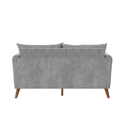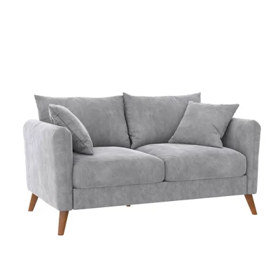 - The loveseat’s pillow back construction, slim rounded club arms, and slanted wood grain finished legs offer a casual feel while its glam velvet upholstery and airy silhouette rev up the charm factor. Pair with the matching 3-seater sofa for extra seating