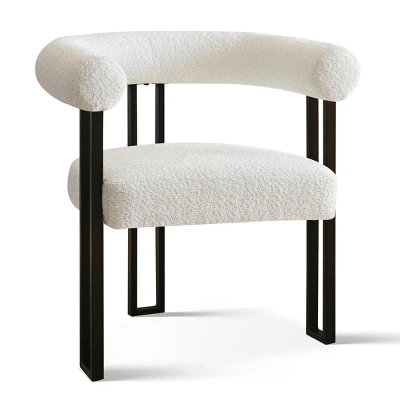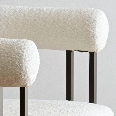 This set of BOUCLE arm chairs is designed to make a modern statement. With a comfortable width suitable for dining, these chairs strike the perfect balance—substantial enough for a satisfying meal without being overly cumbersome at the table. Standing at a height of 28″, they easily slide under different tables, providing flexibility in placement.These chairs feature a sleek silhouette in sophisticated black and white tones, adding a touch of elegance to any space. The premium solid metal frame, combined with a sturdy wood seat frame, ensures durability and reliability.This chair is defined by clean lines and beautiful curves. A matte black frame is interesting from any angle and contrasts against the white velour, creating a comfortable and stylish dining chair. The three legs make it truly a standout choice.Experience the perfect combination of style and functionality with these BOUCLE arm chairs. Ideal for dining, they offer a comfortable seating option while effortlessly complementing various table designs. Their versatile design allows for easy sliding under tables, allowing you to maximize space in any room. The sleek black and white tones add a touch of sophistication, while the solid metal frame and sturdy wood seat frame guarantee long-lasting performance. Upgrade your dining area with these modern and elegant arm chairs today!