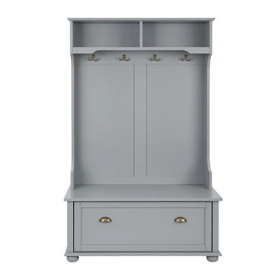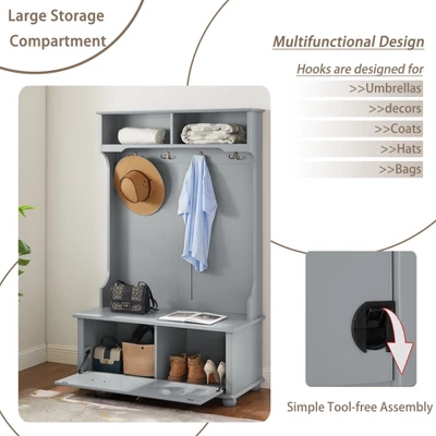 - –4-in-1 Design: This entryway hall tree offers shoe bench, large storage compartment, coat rack, and open shelves in a beautiful 4-in-1 package.