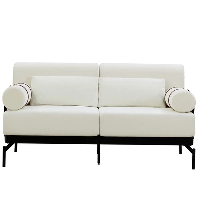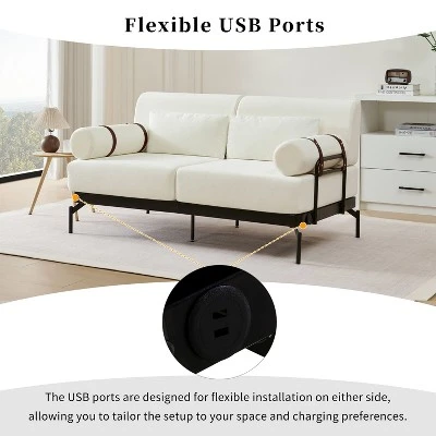 SummaryThis modern loveseat sofa combines bold design with practical features, including unique cylindrical armrests secured with faux leather straps, a built-in USB charging port that can be positioned on either side, and thick 7.8-inch cushions for enhanced comfort. Upholstered in soft chenille fabric and supported by a durable steel frame with sinuous springs, it offers long-lasting support and style. The 7.1-inch elevated legs not only contribute to a sleek look but also allow for easy cleaning and improved airflow, making it both stylish and functional for any living space.Unique Cylindrical ArmrestsThis loveseat showcases two distinctive cylindrical armrests secured with adjustable faux leather straps, combining striking visual appeal with functional support.Integrated USB Portsthis sofa includes built-in USB charging ports integrated into the steel side frame. The USB mount can be installed on either the left or right side, providing flexible configuration options to best fit your room’s layout and charging needs.Product Details:Product TypeSofaOverall DimensionOverall:59″D x33.4″W x 31.5″HSeat Cushion Thickness:7.8″Product WeightOverall:67.9bsPackage DimensionPlease see detailsPackage WeightPlease see detailsWeight Capacity (Per Seat)440lbsSeat Height- Floor to Seat17.3″Seat Deep- Front to Back22″Backrest Height – Seat to Top of the Backrest17.7Pillow Size21.6″*13.7″ColorBeigeUpholstery MaterialChenilleFrame MaterialSteel+Sinuous SpringsSeat ConstructionFoamLeg MaterialSteelRemovable Backrest CushionYesRemovable Backrest Cushion CoverNoRemovable Seat CushionYesRemovable Seat Cushion CoverNoFoam Density1.75 lbs./cu.ftNotes1.Product Care:Dust regularly. Clean gently with a clean, slightly damp cloth. Professional cleaning is recommended. Avoid direct sunlight. Never apply or clean with harsh chemicals.2.Assembly Required:60 Minutes.3.Chromatic Aberration:Manual measurement has been used, there may be some reasonable error. All the pictures are taken by actual samples, slight chromatic aberration may occur due to lighting or display.