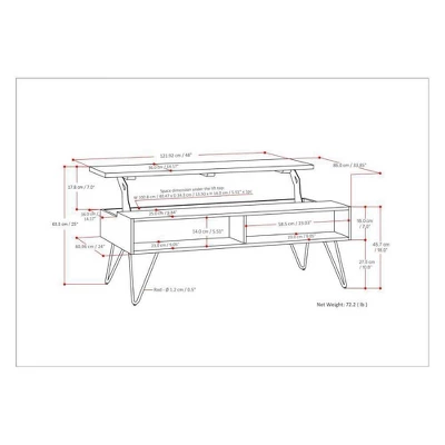 Style and convenience are at work in this uniquely functional Moreno Lift-Top Coffee Table. The top lifts up to reveal hidden storage, pulling toward you for the perfect surface to type on your laptop or eat in front of the television. The table features two open compartments for stacking books or displaying decorative objects. Black iron hairpin legs along with Solid Wood add an industrial component.
