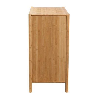 Express a style of casual elegance in your space with the carefree flair of the Naresh storage cabinet. Made in China, this stunning piece exudes mid-century charm with a bamboo frame embellished with crescent windows. The doors open to reveal two spacious shelves to organize household essentials while the tabletop serves as a fantastic display area for decorations. The Naresh requires assembly and features minimalist door handles to draw attention to the natural grain of the wood. Clean lines and rounded legs produce a delightful silhouette, making the Naresh storage cabinet a chic accent in any layout. Overall Dimensions: 31.50″ W x 15.70″ D x 31.50″ H; Shelf Space Behind Door (Each): 28.70″ W x 14.20″ D x 26.00″ H; Clearance: 3.90″ H;