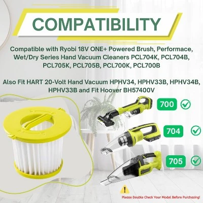 - The filter is compatible with Ryobi ONE+ 18V Handheld Vacuum Models PCL700 PCL704 PCL705. Also Fit HART 20-Volt Hand Vacuum HPHV34, HPHV33B, HPHV34B, HPHV33B and Fit Hoover BH57400V.