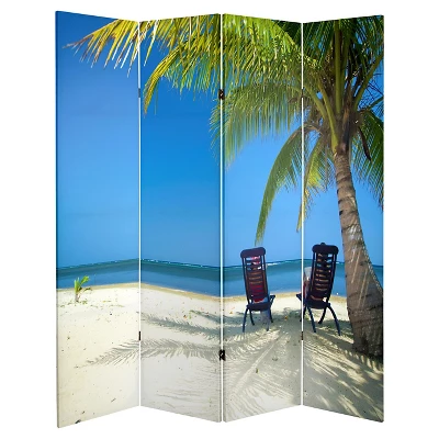 Bring the beach into any room with this Ocean Scene Double Sided Room Divider from Oriental Furniture, featuring vibrant blue waters and sandy surf. 6′ high and 4 panels wide, this decorative screen adds a dramatic splash of color, with contrasting images on either side to keep things fresh. On a practical note, this canvas screen is easy to fold and transport.