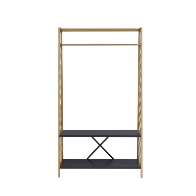 Inspired by contemporary line art, the hall tree showcases a open frame with clean lines that enhances the fashion sense of the space. A gold finsh beautifully complements the metal frame while it’s shelves in a deep black finish highlight your collections. There are two tier shelves and a hanging rail that allow your to showcase your personal style.