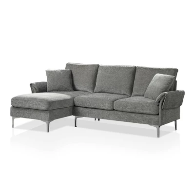 Sleek, thoughtful elements come through in this simple and understated transitional sectional sofa. Covered entirely in a soft and warm chenille fabric, this sectional beckons you to rest between its plushly padded, flared armrests and comfortable box seat style cushions with clean waterfall edges. With a left-right interchangeable chaise and base supported by sturdy chrome-plated steel legs, this sectional is versatile and chic for modern families and homes.