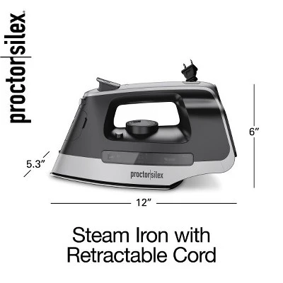 The durable stainless steel soleplate on the Proctor Silex® Steam Iron with Retractable Cord smoothly presses and glides over fabrics, while the precision tip presses hard-to-reach areas. The steam iron provides excellent steam performance to remove wrinkles quickly. It’s powered with 1500 watts to steam away even the most stubborn creases. Versatile steam options include adjustable steam, a spray button for targeting stubborn wrinkles and a blast button that releases quick bursts of extra steam for steam ironing or vertical steam. Loosen wrinkles and refresh clothes right on the hanger with vertical steam. There’s no need no worry if you forget to turn the iron off. The 3-way auto shutoff turns the iron off within 1 minute if it falls on its face or side, and the iron automatically turns off in 30 minutes if it’s left unattended on its heel. The iron has an easy-to-fill water opening and a soleplate that’s designed with anti-drip technology to reduce annoying water drips on clothing. The long 8′ foot retractable cord provides plenty of reach and makes the iron easy to store. The iron has a self-cleaning function and is backed by a 3 year limited warranty.
