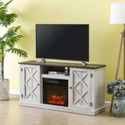 54″ TV Stand For TVs Up To 60″ With Electric Fireplace Saw Cut Off White – Home Essentials
