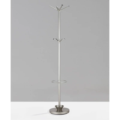 A multi-function accessory that looks good, the Quatro umbrella stand and coat rack takes up minimal space for dorm, office, bedroom, or entry hall. The matte champagne coated steel and chrome accents create a unique contrast. A metal cup at the base catches water from dripping umbrellas. This coat rack measures 67.5″ high and sits on top a 12″ diameter weighted base. The sturdy design can hold up to 50 lbs. The Quatro features 8 total hooks with a 10″ round umbrella stand and is easy to assemble.