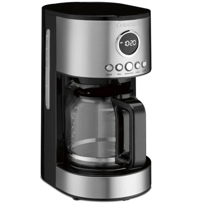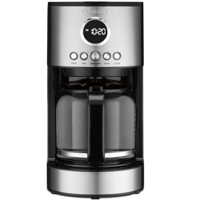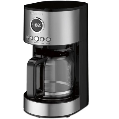 Cuisinart 12 Cup Auto Drip Coffeemaker- Stainless Steel. Easily enjoy upto 12 Cups of coffee at home or on the go. Easily read the measuring marks on the Glass Carafe. Fully programmable with Auto ON, keep an eye on the time with the internal clock. The included warming plate under the carafe can keep your coffee warm for 2 hours before the Auto OFF function turns it off. Super convenient clean function makes cleaning the internals easy. The Cuisinart DCC-1220WM comes with Nylon Filter and coffee scoop. Enjoy delicious coffee that is also convenient and easy with Cuisinart Coffee Makers.