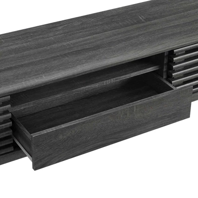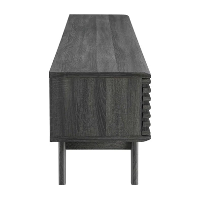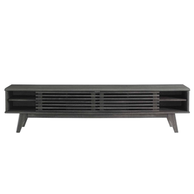 Tap into mid-century aesthetics with the Render 71″ TV Stand. This installment of the Render collection features a durable particleboard frame with smooth walnut grain laminate, four tapered wood legs, an adjustable shelf on both sides, two cable management holes, side vertical storage areas, and two bottom-hinged doors for easy access to shelf storage. This versatile mid-century modern living room table features a solid construction with a pleasing look and practical functionality. Perfect for media storage, Transmit accommodates flat-screen TVs up to 78” wide.