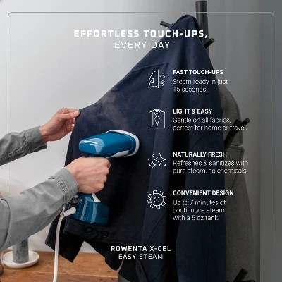 Discover X-cel Steam Easy Handheld Garment Steamer, the steamer that quickly removes wrinkles and purifies all your fabrics. With 1400W of power, steam output up to 25 g/minute and a rapid 15-second heat-up, this intuitive and easy-to-use garment steamer gets you out the door looking your best in no time. The natural power of steam refreshes and sanitizes your clothes while reducing odors for a long-lasting fresh feeling