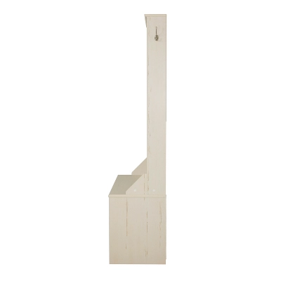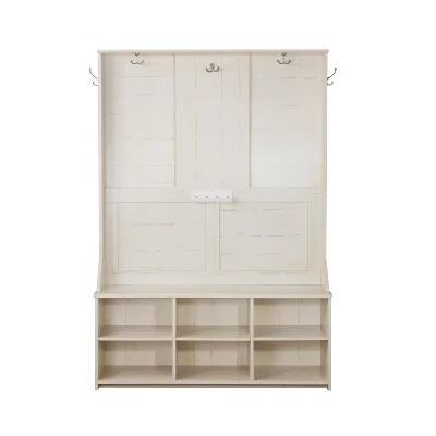 Reimagine your welcoming entryway with the charming style and abundant usefulness of this rustic hall tree and shoe bench. A great way to get organized, it features a creamy white finish with distressing that creates the look of a vintage piece. Its tall, broad design includes a bench for sitting while dealing with shoes and multiple hooks of various types to keep all manner of coats and accessories tidy and organized. Underneath the bench, six cubby shelves can be used to keep shoes off the floor or for organizing small accessories. Add decor to the top or offer a spot for purses that’s out of reach for small hands.This cabinet’s dimensions are 67 inches high x 46.8 inches wide x 15.7 inches deep. Saint Birch’s mission is to help everyone create a better home, where one can find affordable style and comfort. We strive to ensure every customer’s experience with our products is warm, worry-free, and comfortable.