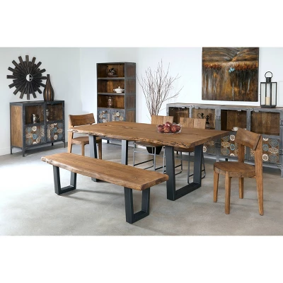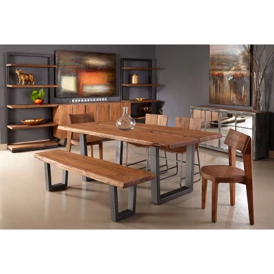U-shaped metal supports form a perfectly simple base for this table’s focal top of two generously-sized boards connected by a center row of eye-catching bowtie key joinery. Eased edges follow the natural curves of the wood, while a Sequoia Light Brown Acacia finish highlights all the organic beauty of the grain.