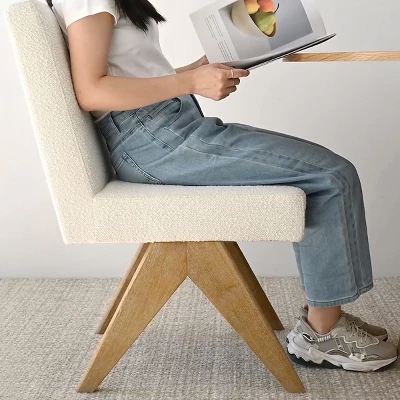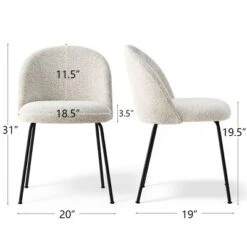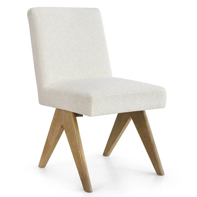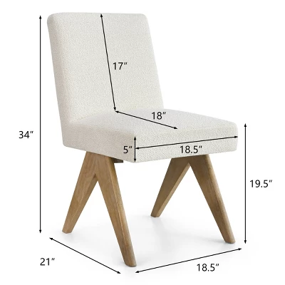 Add sculptural elegance and cozy texture to your dining space with this set of 2 modern boucle dining chairs. Featuring clean lines, a minimalist silhouette, and a distinctive inverted V-shaped leg design, these armless upholstered side chairs bring an elevated look to any dining room or kitchen table.Each chair is crafted with a sturdy solid oak wood base in a warm natural finish, perfectly complementing the rich texture of the cream boucle fabric. The plush padded seat and tall backrest offer both comfort and support for everyday meals or special gatherings.Sized at 34″H × 18.5″W × 21″D, with a seat height of 19.5″, a seat width of 18.5″, and a 17″ back height, these upholstered dining chairs provide ergonomic seating without arms, making them ideal for tighter spaces or minimalist interiors.Whether you’re styling a modern farmhouse dining room, a mid-century breakfast nook, or a Japandi-inspired kitchen, these boucle V-leg dining chairs deliver refined comfort and standout style.