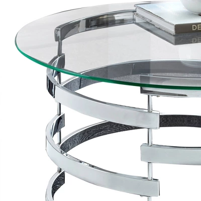 Contemporary style meets functionality with this Teegan Coffee Table from Steve Silver Co. This circular coffee table has a unique cut-out shiny chrome frame that creates an open and airy design. It has a tinted glass top that’s perfect for displaying decor or holding a book and a cup of coffee. This circular glass and chrome coffee table is the perfect addition to any living space in your home with its sleek and bold design.