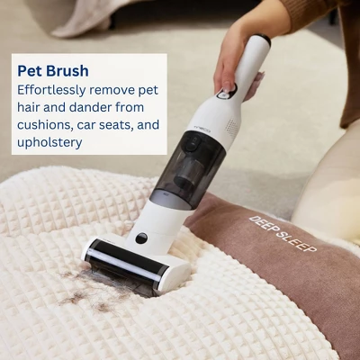 - Pet Brush Included: Equipped with a specialized Pet Brush, this handvac efficiently removes pet hair and dander from couch cushions, car seats, and upholstery fabrics. Keep your spaces clean and allergen-free effortlessly.