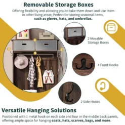 - The bottom of the cabinet boasts nine small compartments of varying sizes, effortlessly accommodating shoes or clutters of different dimensions. The front and sides of the product feature a total of seven hooks, ideal for hanging your umbrellas, hats or coats. It offers versatile storage options for your belongings, presenting you with a tidy entryway.: